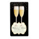 Zwei blubbling Flöten von Champagner-Weinetiketten vor einem schwarzen und cremefarbenen Hintergrund. Personalisiert mit Namen, Datum und einer kurzen Meldung.