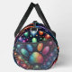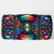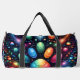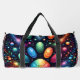 This unique duffle bag features a dazzling colorful pattern of sparkling cosmic elements, including abstract vibrant shapes and stardust on a dark background. It's a stylish and versatile travel gear piece, ideal for everyday use as an organizer.
