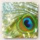 Glamouröser Untersetzer mit wunderschöner Pfauenfeder, glänzender Silberfräse und glitzerndem Licht