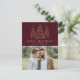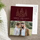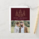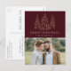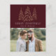 Moderne und elegante Urlaubspostkarte mit Foto und schneebedecktem Imitat mit goldfarbenem Kiefernholz mit bordeauxfarbenem Hintergrund. "Frohe Weihnachten" wird in einem weißen, modernen Serif-Schriftart mit Ihrem Namen oder benutzerdefinierten Text unten angezeigt. Die Foto Ferien Postkarte kehrt um Ihre Rücksendeadresse und benutzerdefinierte Nachricht anzuzeigen.