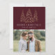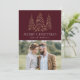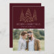 Moderne und elegante Urlaubskarte mit Ihrem Foto, ergänzt durch drei schneebedeckte Imitate mit goldfarbenen Kiefernwäldern mit bordeauxfarbenem Hintergrund. "Frohe Weihnachten" wird in einem weißen, modernen Serif-Schriftart mit Ihrem Namen oder benutzerdefinierten Text unten angezeigt. Die Foto-Urlaubskarte kehrt zurück, um ein zusätzliches Foto mit Ihrer benutzerdefinierten Nachricht unten in weißem Text anzuzeigen.