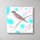 Der farbige Bleistift, der von einem Spatzen gezeichnet wird, der in einem Kirschblossom-Baum mit abstraktem Himmel und Wolkenhintergrund sitzt, wird auf eingewickelten Leinendrucken gedruckt.