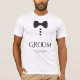 Diese Spaß-T - Shirts sind besonders für den Bräutigam konzipiert. Der T - Shirt ist weiß und kennzeichnet ein Bild einer schwarzen Bogen-Krawatte und drei Knöpfe. Der Text liest Bräutigam und hat einen Platz für das des Hochzeitsnamen- und Hochzeitsdatum Paares. Großer Zusatz zu einer Hochzeit Swagtasche.
