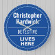 Vergnügen Gedenkmauer Wandbehängung in Form einer Wall-Uhr für einen Polizeidetektiv. Blaue und weiße Plakette. Bearbeiten Sie das Design, um die Formulierung so zu ändern, dass der Empfänger des Geschenks Anzug erhält.