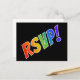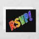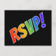 Dieses einfache und unterhaltsame UAWG Postkartendesign zeigt die Nachricht "UAWG!" auf der Vorderseite in Buchstaben mit einem Regenbogenspektrum wie Farbgebung auf schwarzem Hintergrund. Auf der Rückseite befinden sich ein benutzerdefinierbares Formular und eine anpassbare E-Mail-Adresse, an die die ausgefüllten RSVP-UAWG gesendet bzw. zurückgegeben werden sollen.