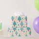 Die lustigen Farben schmücken fröhlich kleine Weihnachtsbäume, die über diesem hellen Verpackungspapier umgehen. Ein helles, aquamarines Grün begünstigt die festlichen Bäume inmitten von rosa und gelben Sternen auf weißem Hintergrund. Diese sind aus einem Retro-Aquarellmuster.