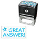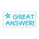Dieses motivierende Gummi-Briefmarke-Design beinhaltet die Nachricht "GROSSE ANTWORT!". Es hat auch eine dekorative Sternform. Es könnte von einem Lehrer, Erzieher, Ausbilder oder Tutor verwendet werden, um anzuzeigen, dass der Schüler gut abgeschnitten hat.