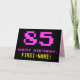 Die Vorderseite dieses lustigen, geeky und nerdy Geburtstag Thema Grußkarte Design verfügt über eine große rosa Zahl "85", zusammen mit der Meldung "HAPPY BIRTHDAY", in pink, und einen kühnen gelben benutzerdefinierten Empfänger Namen. Der Text hat einen inspirierten Look mit dem klassischen 8-Bit-Computergrafik/Videospielgrafik aus den 1970er und 1980er Jahren, und der Hintergrund ist schwarz. Im Inneren befindet sich eine individuell anpassbare Geburtstags-Grußnachricht, oder vielleicht kann gelöscht und links werden, wenn eine Nachricht von Hand geschrieben werden soll. Eine alberne personalisierte Geburtstagskarte wie diese könnte eine lustige Art sein, eine Botschaft zum Feiern des fünfundachtzigsten Geburtstages von jemandem zu senden. [~Z0000478]