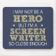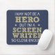 Ich bin vielleicht kein Held, aber ich bin ein Drehbuchautor, der so nah genug humorvolle Wortkunst in Sans-Serif und doodle Cross-Luch-Schriftart zeigt, der in weiß und goldgelb mit zwei bedrückten Akzent-Sternen schrieb.
