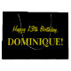 Eine Seite dieses einfachen und lustigen Geburtstags-Thema Geschenktasche Design hat eine große Zahl "13" mit einem dunkelrosa und hellrosa Streifen Muster. Auf der anderen Seite finden Sie die Geburtstagsgrüßbotschaft "Happy 13 th Birthday" und einen personalisierten Namen, beide in gelbem Text. Der Hintergrund ist schwarz gefärbt. Geschenktaschen wie diese können zum Umpacken von Geschenken oder Geschenken verwendet werden, die zu Ehren von jemandem zum dreizehnten Geburtstag gegeben werden. [~Z0000378]