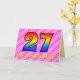 Dieses fröhliche und optimistische 27. Geburtstagskarten-Design hat eine Vorderseite mit einer großen Zahl "27" mit einem bunten Muster inspiriert durch das Aussehen eines Regenbogenspektrums, auf einem dunkelrosa und hellrosa Herz Streifen Muster Hintergrund. Auf der Vorderseite befinden sich auch die Meldung "Happy 27 th Birthday" und ein bearbeitbarer Empfängername. Im Inneren befindet sich eine benutzerdefinierte Geburtstagsgrüßbotschaft, oder man könnte sie löschen und leer verlassen werden, wenn eine Nachricht von Hand geschrieben werden soll. Eine personalisierte Geburtstagskarte wie diese könnte eine lustige und glückliche Art sein, eine Botschaft zum Feiern des siebenundzwanzigsten Geburtstages von jemandem zu senden. [~Z0000418]
