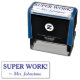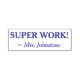 Dieses ermutigende Design der Gummi-Briefmarke zeigt die positive Botschaft "SUPER WORK!" und einen personalisierten Bildungsnamen. Es könnte von einem Lehrer, Pädagogen oder Tutor verwendet werden, um zu bestätigen, dass der Schüler gut abgeschnitten hat.