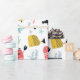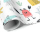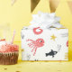 Dieses hübsche Packpapier mit weißem Hintergrund mit niedlichen Cartoon-Meereslebewesen, darunter ein rotes Seepferd, gelbe, schwarze und hellblaue Fische, eine lustige rote Krabbe, Seesterne und einige Algen.