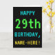 Dieses einfache, lustige Geburtstagskarten-Design enthält eine Nachricht wie "HAPPY 29. BIRTHDAY, NAME-HERE!". Es zeigt auch ein lustiges, pixeliges Aussehen, das an das Erscheinungsbild von Videospielen aus der 8-Bit-Zeit Retro-Zeit der 1980er und frühen 1990er Jahre erinnert. Der Name auf der Vorderseite und die Meldung auf der Innenseite können personalisiert sein. Es könnte jemandem geschickt oder gegeben werden, der seinen neunundzwanzigsten Geburtstag feiert und Vintage Computerspiele spielt. [~Z0000099]