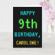 Dieses einfache, lustige Geburtstagskarten-Design enthält eine Nachricht wie "HAPPY 9. BIRTHDAY, CAROLINE!". Es erinnert an das Erscheinungsbild der klassischen Computerspiele der 8-Bit-Ära in den 1980er und frühen 1990er Jahren. Der Name auf der Vorderseite und die Meldung auf der Innenseite können personalisiert sein. Es könnte jemandem geschickt oder gegeben werden, der seinen neunten Geburtstag feiert und Vintage Videospiele spielt. [~Z0000099]