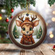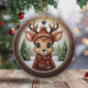 Spaßige winterliche Weihnachtsdekoration mit Wildtieren. Personalisierbarer rustikaler Holzrahmen für Weihnachten mit Rentieren. Hirsch mit Geweih als maßgeschneiderter Weihnachtsbaum-Schmuck aus Keramik. Innen befindet sich ein süßes Baby-Waldtier im Cartoon-Stil, das einen Mantel, einen Hut mit anpassbarem Text und einen Schal trägt. Im Hintergrund vervollständigt eine winterliche Schneelandschaft den Charme dieses einzigartigen weiblichen Hirsches. Die doppelseitige Illustration sorgt dafür, dass das Design unabhängig von der Aufhängung immer festlich und vollständig aussieht. 🦌🎄