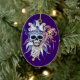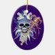 Karnevalart Spaßvogelschädel trägt New- Orleansartmaske in den Farben von blauem und silbrigem weißem und hält einen Goldschädel Spaßvogel Scepter.