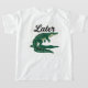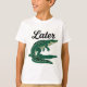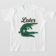 Eine lustige und stilisierte Abbildung eines grünen Krokodils mit schwarzen Flecken und einem blassen Unterbauch, in einer gekrümmten Haltung mit seinem nach unten ausdehnenden Schwanz gestellt. Über dem Krokodil wird das Wort "Später" fett, schwarz kursiv geschrieben, wodurch dem Bild ein lässiger und humorvoller Ton hinzugefügt wird. Der Schatten des Krokodils begründet die Komposition, während der saubere, weiße Hintergrund den Fokus auf Charakter und Text behalte. Dieses Design verbindet geschickt visuellen Charme mit einer spielerischen Abschiedsbotschaft.
