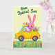 This greeting card features a pink, rabbit-like character with long ears and a wide grin showing two front teeth, leaning forward as it drives a small yellow car 🐰. The car has a tiny red rack on top, and the character’s eager posture gives the scene a friendly, affectionate energy, like it’s rushing to deliver something sweet. A pale yellow sky fills the background in even light, keeping the focus on the bright central figure. Along the bottom, a green strip of ground is scattered with simple flowers in yellow, fuchsia, blue, and purple 🌷. A full bouquet of mixed blossoms spills out from the back of the car, suggesting a thoughtful gift meant for someone close. Near the top, the words “Our Special Son” appear in dark green lettering, centered and easy to spot against the light backdrop. The wheels stand out with rainbow-colored spokes arranged like a pinwheel on each tire.