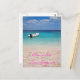 Postkarte eines Speedbootes im türkisblauen Wasser des Mittelmeers am kleinen weißen Strand von Cala Goloritze im Golf von Orosei, Sardinien, Italien mit dem tekst "Baci da Sardegna", italienisch für: "Kisses von Sardinien".