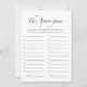 The Schürze Game - eine stilvolle und minimalistische Schwarz-Weiß-Brautparty-Spielkarte von CaMiDesigns. Dieses elegante Spiel verleiht Ihren Brautfeiern eine unterhaltsame Drehung und ermutigt die Gäste, sich zu engagieren und bleibende Erinnerungen zu schaffen. Das schicke Design ergänzt jedes Brautparty und bietet allen ein angenehmes Erlebnis. Für Unterstützung bei Bestellungen, Versand, Produktinformationen und vielem mehr wenden Sie sich bitte direkt an den Zazzle Kundenservice.