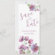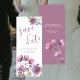 Speichern Sie die Date Watercolor Purple Floral Card, die mit hellvioletten Blumen auf weißem Hintergrund entworfen wurde. Der erste Text enthält: Save the Date, The Bride and Groom's First Names and Wedding Date. Der umgekehrte Text enthält: Der Ort der Hochzeit und die förmliche Einladung zur Befolgung auf violettem Hintergrund. Um Ihre persönlichen Daten zu personalisieren, fügen Sie einfach Ihre Daten in unsere einfache Vorlage ein und ersetzen den Beispieltext. Verfügbar in Print oder Digital Download.