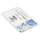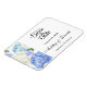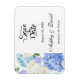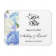 Save the Date Magnet wird in einem klassischen formalen Layout in der Farbe weiß angezeigt, mit schwarzem Text und Skripttext, der die Namen von Bride und Groom hervorhebt und mit einem hydrangea-Blume-Druck versehen ist. Klicken Sie auf die Schaltfläche Anpassen, gehen Sie rechts zu den Textfeldern und ändern Sie den entsprechenden Text in Ihren Text. Stock Image freepik.com all-free-download.com