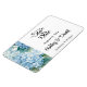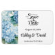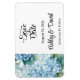 Speichern Sie den Date-Magneten wird in einem klassischen formalen Layout in der Farbe weiß angezeigt, mit schwarzem Text und Skripttext, der die Braut- und Gräuelnamen hervorhebt und mit einem Hydrangea-Blume-Druck akzentriert ist. Klicken Sie auf die Schaltfläche Anpassen, gehen Sie rechts zu den Textfeldern und ändern Sie den entsprechenden Text in Ihren Text. Lizenziertes Bild