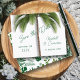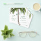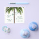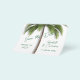 Tropische Palme, Save the Date Hochzeitsankündigung auf Flyer gedruckt. Eine Single-Palme mitten in den weißen Karten mit Palmblättern, die über dem Text hängen. Der Text "Save the Date" ist verworren. Das Datum befindet sich auf der einen Seite des Kofferraums mit Namen und Veranstaltungsort auf der anderen Seite. Die Rückseite ist mit tropischen Blätter in Grüntönen gestaltet. Farbe ist grün und weiß für ein einfaches, sauberes Design.