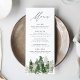 Elegante, individuelle Hochzeitsmenükarte mit den Details Ihres Hochzeitsmenüs am oberen Ende der Speisekarte mit einem Wald aus dunklen Jägergrün und Salbei Wasserfarben Kiefern am unteren Rand. Das Menü wechselt zu einem dunkelgrünen Hintergrund für Jäger mit Platz für Text und Fotos. Entworfen, um sich mit unserer Hochzeitskollektion Rustic Pine Forest abzustimmen.