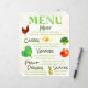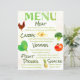 Passen Sie dieses Party-Menü mit Ihren eigenen Menüpunkten an. Es ist ein lustiges und rustikales Menü mit Aquarellfrüchten und Veggies und einem handgeschriebenen Stil Schriftart. Ideal für lässige Anlässe!