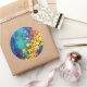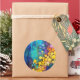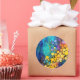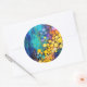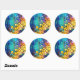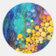 Ein Gemälde mit bunten Bläschen vor tiefblauem Hintergrund im geometrisch abstrakten Stil. Die Farben sind reich und lebendig und sorgen für ein auffälliges und dynamisches visuelle.