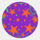 Aufkleber mit einem lila und grünen Hintergrund, der mit zauberhaften, leuchtenden orangen und grünen Sternen verstreut ist. Ein lila, grünes und orangefarbenes Design für Sie, um Ihre eigenen Texte, Bilder und Ideen hinzuzufügen. Erstellt mit digitalen Techniken von Jess Perry.