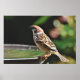 Ein Poster mit einem niedlichen Spatzen, der auf einem Vogelbad steht.
