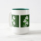 Weiße Kleeblätter auf einem Bett von Irish Green dekorieren diese zwei Töne 15 oz Tasse, um Ihnen zu helfen St. Patrick's Day zu feiern. Füllen Sie es bis zum Rand mit Ihrem Lieblingsgetränk, Kaffee, Tee, Irish Whiskey oder ein wenig "die Spirituosen" Ihres Designs. Egal, was Sie wählen, Sie werden das Irische jedes Mal, wenn Sie einen Schluck von seiner hübschen Tasse nehmen, toasting.
