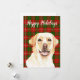 Urlaubskarte mit Aquarellbild von Labrador Retriever auf festlichem, grün und rot kariertem Hintergrund und individualisierbarem Holiday Gruß.