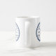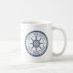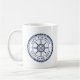 Coffe-Tasse mit dunkelblauen, eleganten Schiffsmalben und Seilschildern mit dem Namen Ihres Kapitäns und Bootsnamens auf weißem Hintergrund.