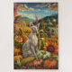 Feiern Sie die Schönheit des Herbstes mit diesem lebendigen Gemälde einer Katze, die neben einer reichen Erntedank-Ernte sitzt. Die reichen Herbstfarben von Kürbissen, Sonnenblumen und die rustikale Landschaft der Bauernhäuser schaffen eine warme und einladende Atmosphäre, perfekt für jeden Cat Liebhaber der saisonalen Dekoration.