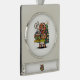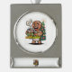 A joyful, cartoon-style Gingerbread Man, depicted with a wide, enthusiastic smile and rosy cheeks. He's wearing a simple white apron and heartily holding up a clear mug filled with dark, steaming coffee, with a prominent plume of steam curling upwards. The text "Spicy and Caffeinated" is creatively integrated onto the coffee mug in a bold, vibrant, multi-colored font, featuring subtle star and flake embellishments. In the background, a minimalist yet festive green Christmas tree is adorned with red and gold baubles, topped with a star, and radiating faint yellow light rays. The overall style is clean, cheerful, and graphically strong, with clear outlines.