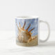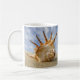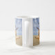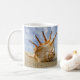 Schließen Sie das Foto einer Muschel aus einer Spinnenne auf einem Sandstrand gegen den blauen Himmel mit weich bewölkten Wolken. Maßgeschneiderte Tasse, Größe, Stil und Farbe.