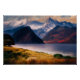 Die Sonne lässt sich am Horizont von sich lassen und malt den Himmel in goldenen und orangefarbenen Tönen. Das schlichte erstreckt sich sanft in Richtung Fluss, der den letzten Lichtern des Tages entspricht. Im Hintergrund vervollständigen majestätische Berge die Szene und schaffen ein ruhiges und faszinierendes Naturspektakel.