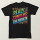 Der T - Shirt-Design enthält den Satz "Play, Conquer, Celebrate" in einem lebendigen, spielerischen Schriftart. Die Farben sind hell und dynamisch und reflektieren ein Gefühl von Spannung und Leistung. Das Gesamtdesign ist dynamisch und auffällig, es ist perfekt für jeden, der einen Geist des Wettbewerbs und des Feierns annimmt.