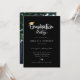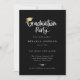 Spielvolles weißes Skript mit goldenem Graduiertenkappenakzent, Graduierungsparty Einladung. Features, schwarzer Hintergrund und Single Foto auf der Rückseite.