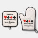 Wenn Sie Bridge spielen - das Spiel der Bridge oder Duplikatbrücke -, dann genießen Sie dieses Sprichwort-Backofen-Mitt und Pothalter-Set mit den folgenden Bridge-Ratschlägen: "Play Bridge - Without Reservation & Without Resistance". Kommt mit den vier Karten-Anzügen. Machen Sie eine Doppelannahme auf, wie das Spiel der Brücke mit einer Dosis von Zunge-in-Wange Bridge Spaß mit diesem Ofen Mitt und Pot-Inhaber Set!