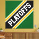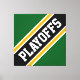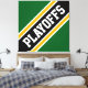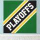 Dieses sportliche Fußball-Design beinhaltet den sportlichen PLAYOFFS-Text in hervorgehobenen breiten diagonalen schwarzen, weißen und goldgelben Rennstreifen vor waldgrünem Hintergrund. Die Farben und Texte in diesem Design können personalisiert sein.