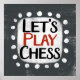 "Let's Play Schach" ist ein niedliches Textdesign in Grau mit schwarzem und rotem Text, zusammen mit einer weißen Akzent-Form und weißen texturierten weißen, weißgetönten weißen Punkten, die ihn umgeben.