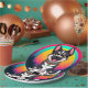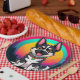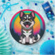 Illustration eines fröhlichen Cartoon-Hundes, der vor einem farbenprächtigen Regenbogen-Hintergrund sitzt und ein spielerisches Ambiente bietet, umgeben von einer ruhigen Waldlandschaft, die Freude und lebendige Kunst betont.