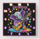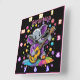 Ein skurriler Elefant mit lebendiger lila Haut umgibt eine hellgelbe Gitarre, umgeben von bunten Blasen und einer fröhlichen Regenbogenkulisse und schafft so eine lebendige Atmosphäre des Feierns.