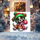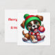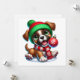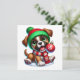 Feiern Sie den Urlaub mit diesem spielerischen Welpe in einer grünen Mütze und einem roten Schal, glücklich mit einem festlichen Ornament. Eine fröhliche Karte für die Verbreitung von Urlaub lächeln