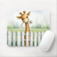 Eine spielerische Giraffe, die über einen weißen Zaun mit einem zitternden Mund guckt.